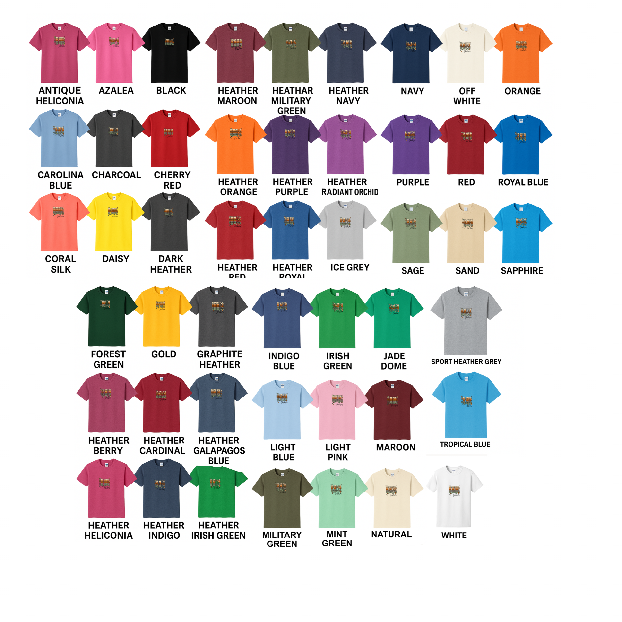 | Color | Antique Heliconia, Azalea, Black, Carolina Blue, Charcoal, Cherry Red, Coral Silk, Daisy, Dark Heather, Forest Green, Gold, Graphite Heather, Heather Berry, Heather Cardinal, Heather Galapagos Blue, Heather Heliconia, Heather Indigo, Heather Irish Green, Heather Maroon, Heather Military Green, Heather Navy, Heather Orange, Heather Purple, Heather Radiant Orchid, Heather Red, Heather Royal, Ice Grey, Indigo Blue, Irish Green, Jade Dome, Light Blue, Light Pink, Maroon, Military Green, Mint Green, Natural, Navy, Off White, Orange, Purple, Red, Royal Blue, Sage, Sand, Sapphire, Sport Heather Grey, Tropical Blue, White |